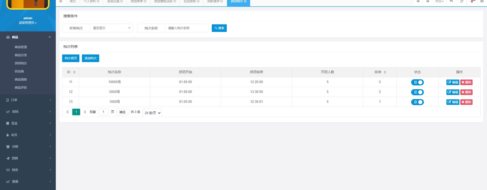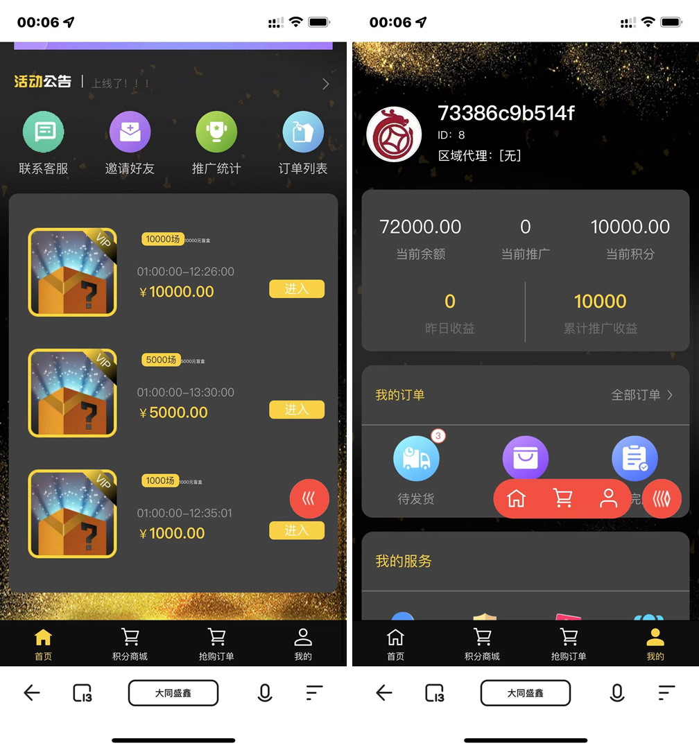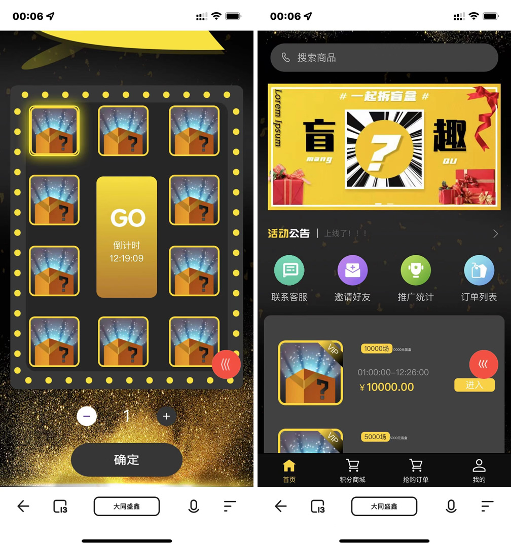 抽奖拼团玩法,三个房间,每个房间的价格不一样,比如1000的房间,里面的商品价格是1000以内的,用户购买之后等待开奖,然后平台随机发货,盲盒模式